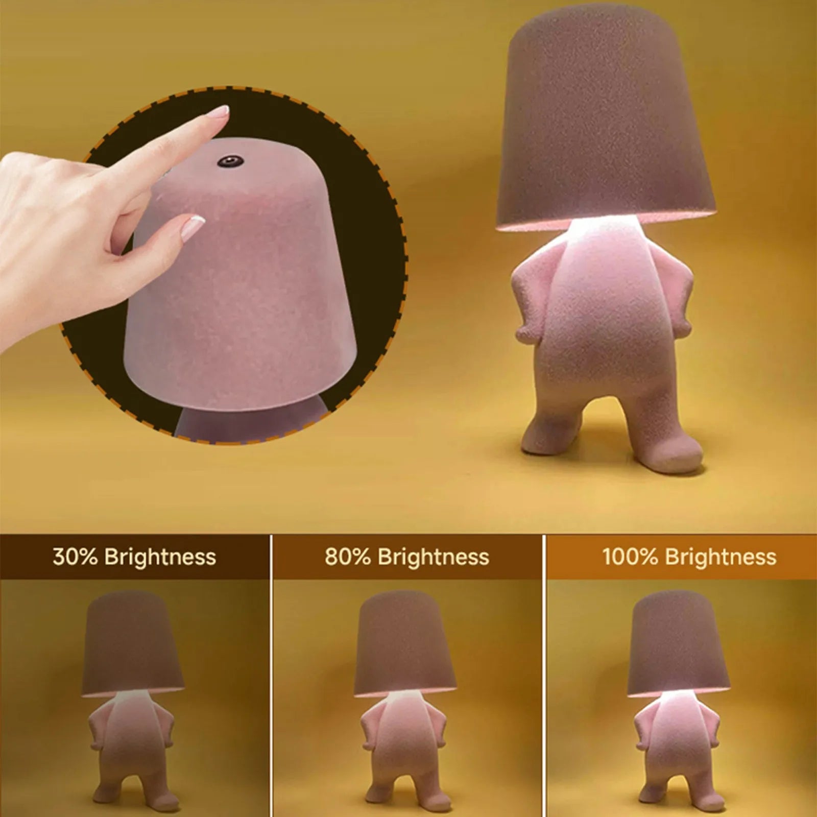 The flocked texture creates a soft. tactile surface that feels as cozy as it looks. while the warm glow of the LED bulb radiates from beneath a matching. head-shaped lampshade. With touch-sensitive dimming at the top and three adjustable light temperatures (cool. warm. and neutral white). you can customize the mood to fit the moment.