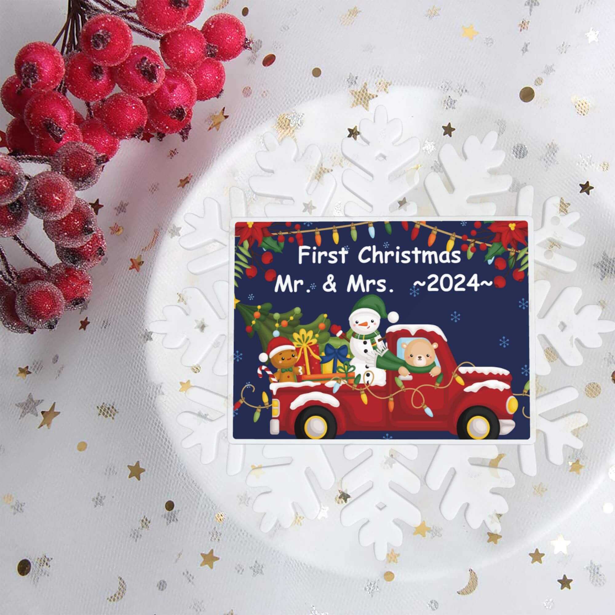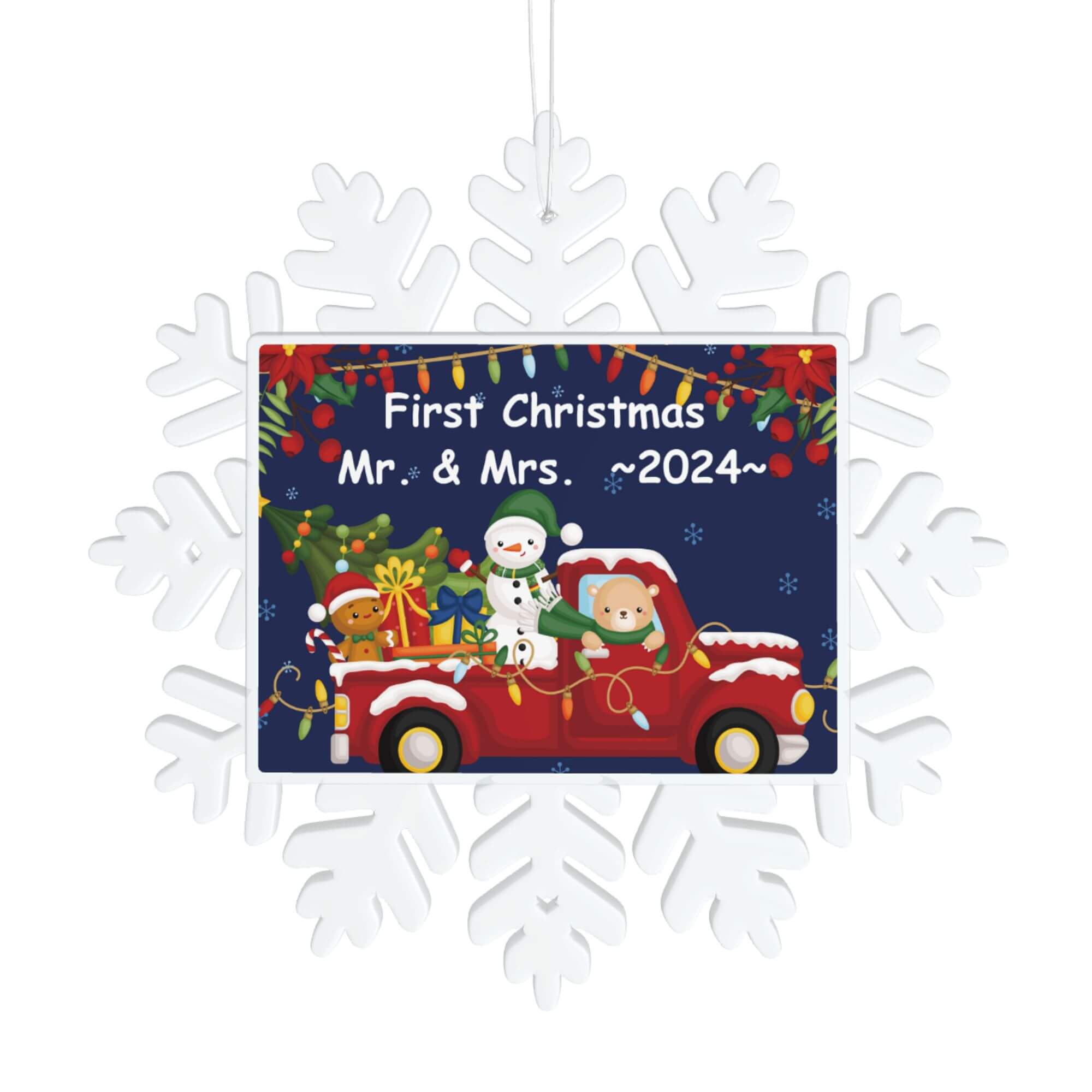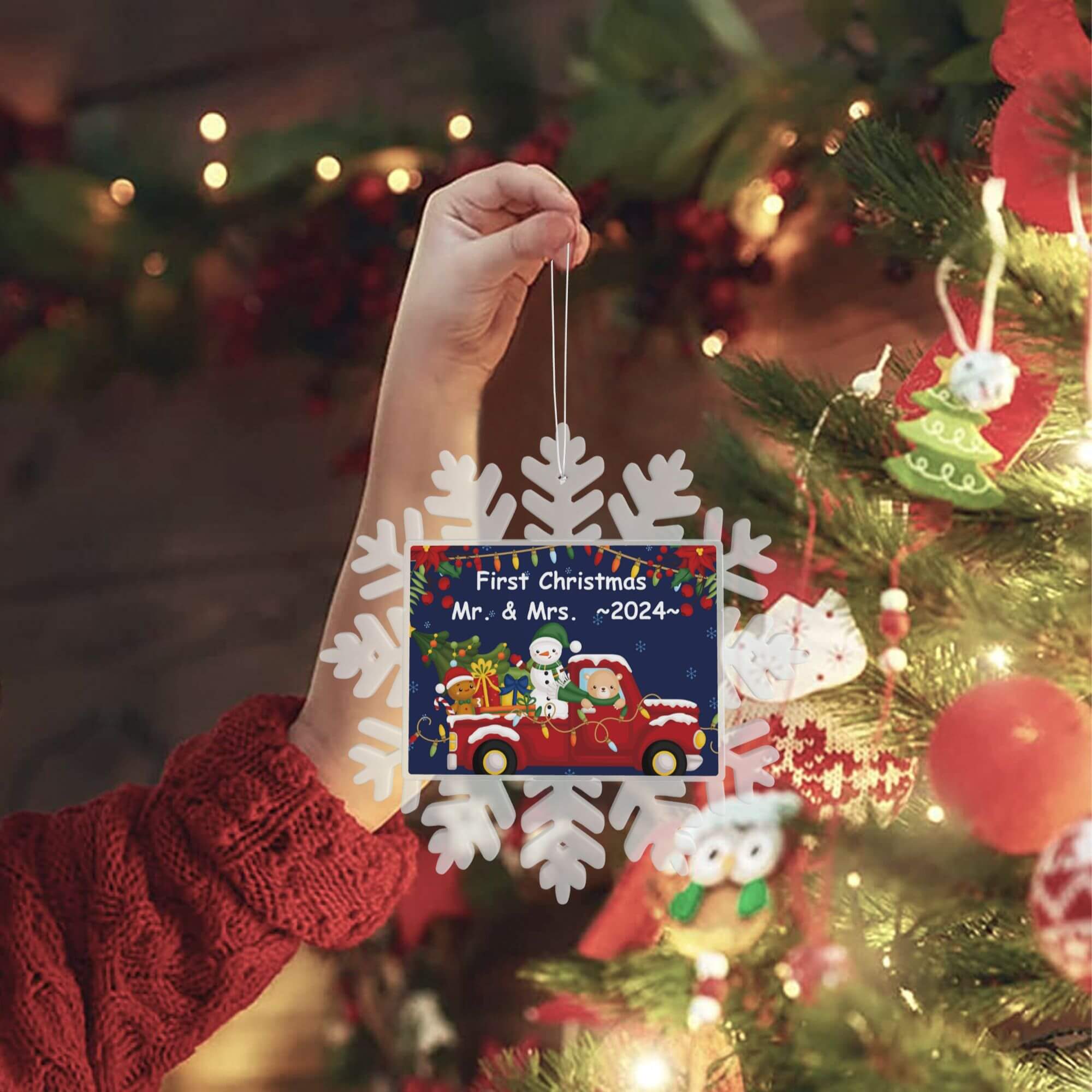 🎄 Custom first Christmas snowflake ornaments for couples family as holiday gifts. Simplely click "Customize now" button. input your message. our professional designers will do everything else for you to achieve the best results.
