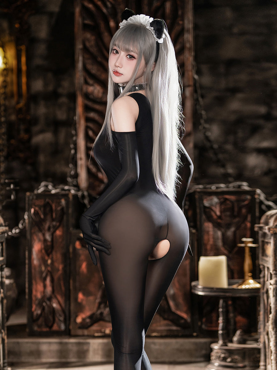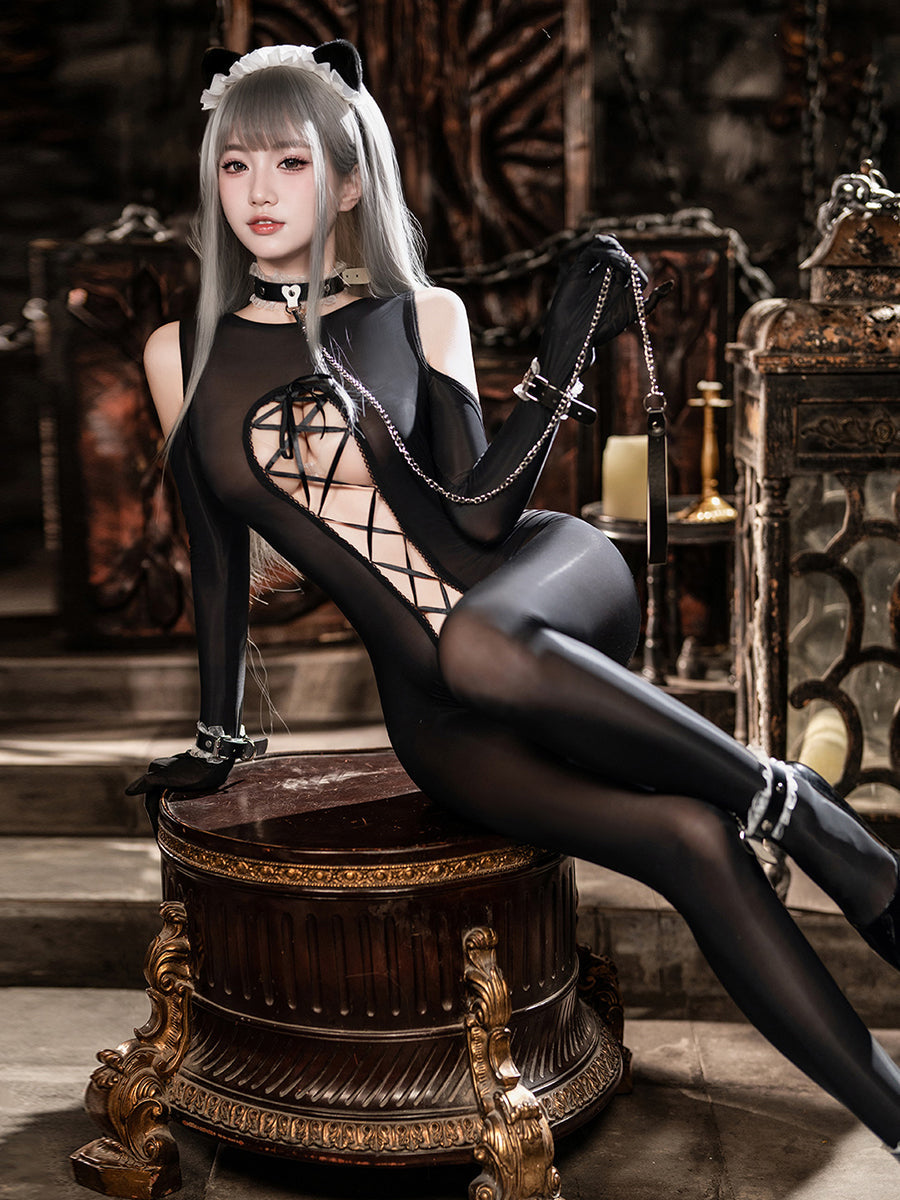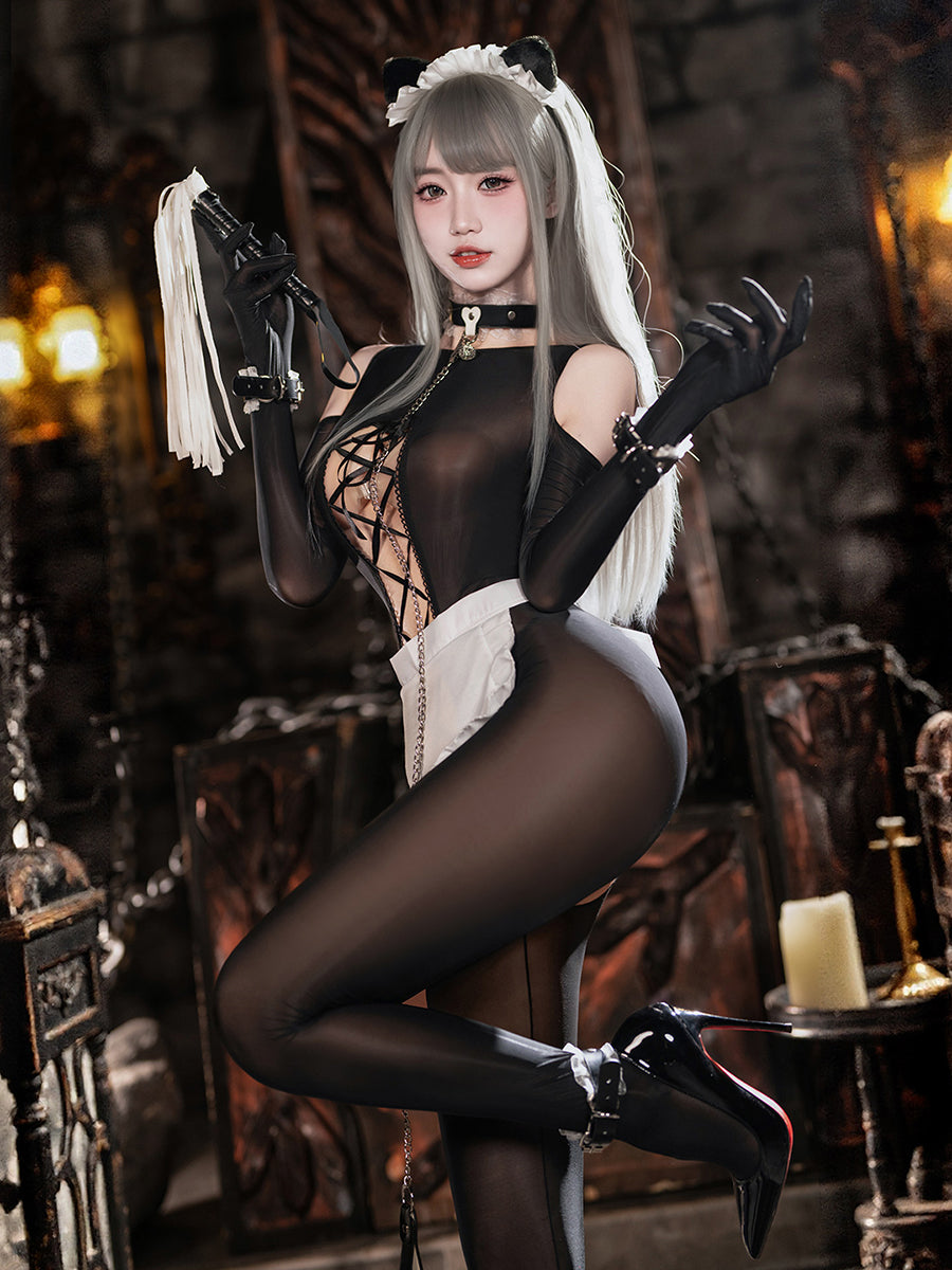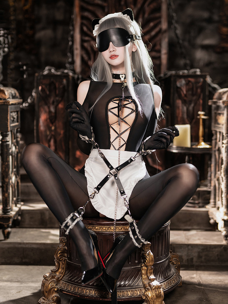Design: This sexy maid costume featuring a black sheer bodystocking with open crotch design. cold-shoulder cutouts. front lace-up closure. making it both sexy and practical. A white maid apron. and a matching faux leather restraints kit. with this outfit. you'll feel confident and alluring. no matter the occasion.