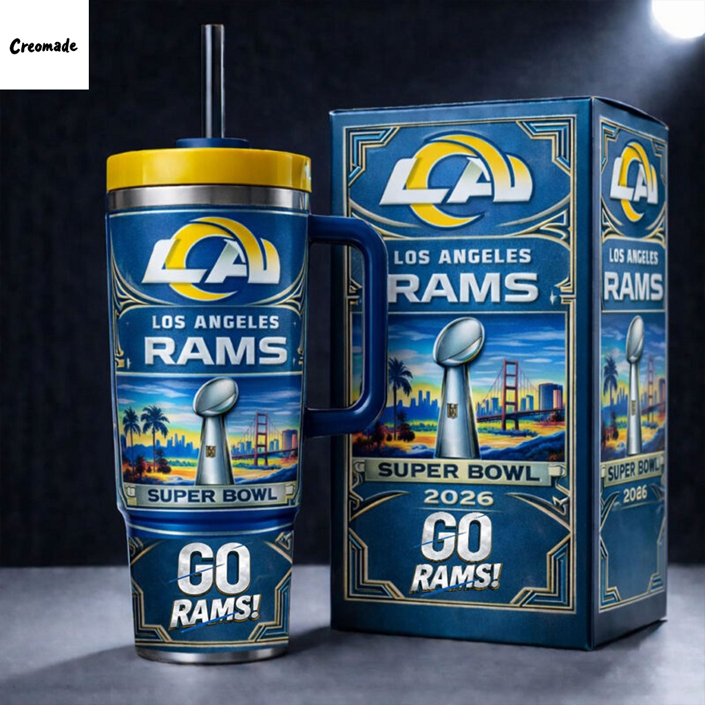 Visually, the tumbler is a striking testament to Los Angeles Rams pride and Super Bowl LX anticipation. Adorned with a vibrant, high-definition, and fade-resistant powder-coated finish in the iconic Rams blue, it immediately catches the eye. The official Super Bowl LX 2026 logo is prominently displayed, meticulously integrated with the Los Angeles Rams’ instantly recognizable ram horn emblem, signifying not just team allegiance but a specific, historic event. Bold “Go Rams” text, rendered in an energetic, team-appropriate font, reinforces the rallying cry, making it clear where your loyalties lie. Subtle design elements perhaps hint at the Los Angeles skyline or palm trees, grounding the event in its host city and adding a layer of sophisticated detail that elevates it beyond a standard fan item. The design is not merely printed but integrated with precision, guaranteeing it will withstand countless washes and continued use without peeling or fading, maintaining its fresh, celebratory appearance for years.