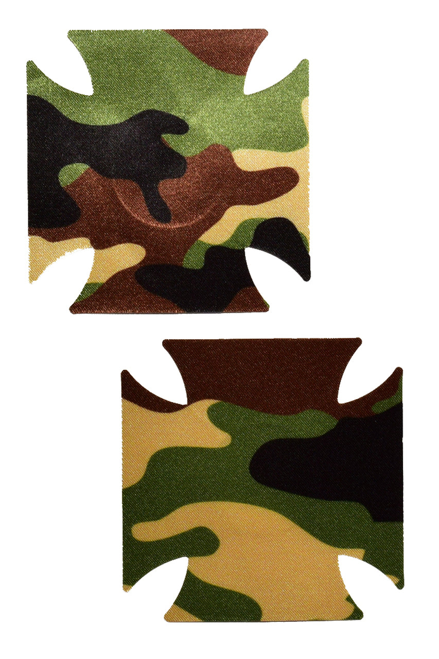 Double Cross Camouflage Nipple Pasties. Feature self adhesive tape. just peel and stick on clean. dry. oil-free skin.