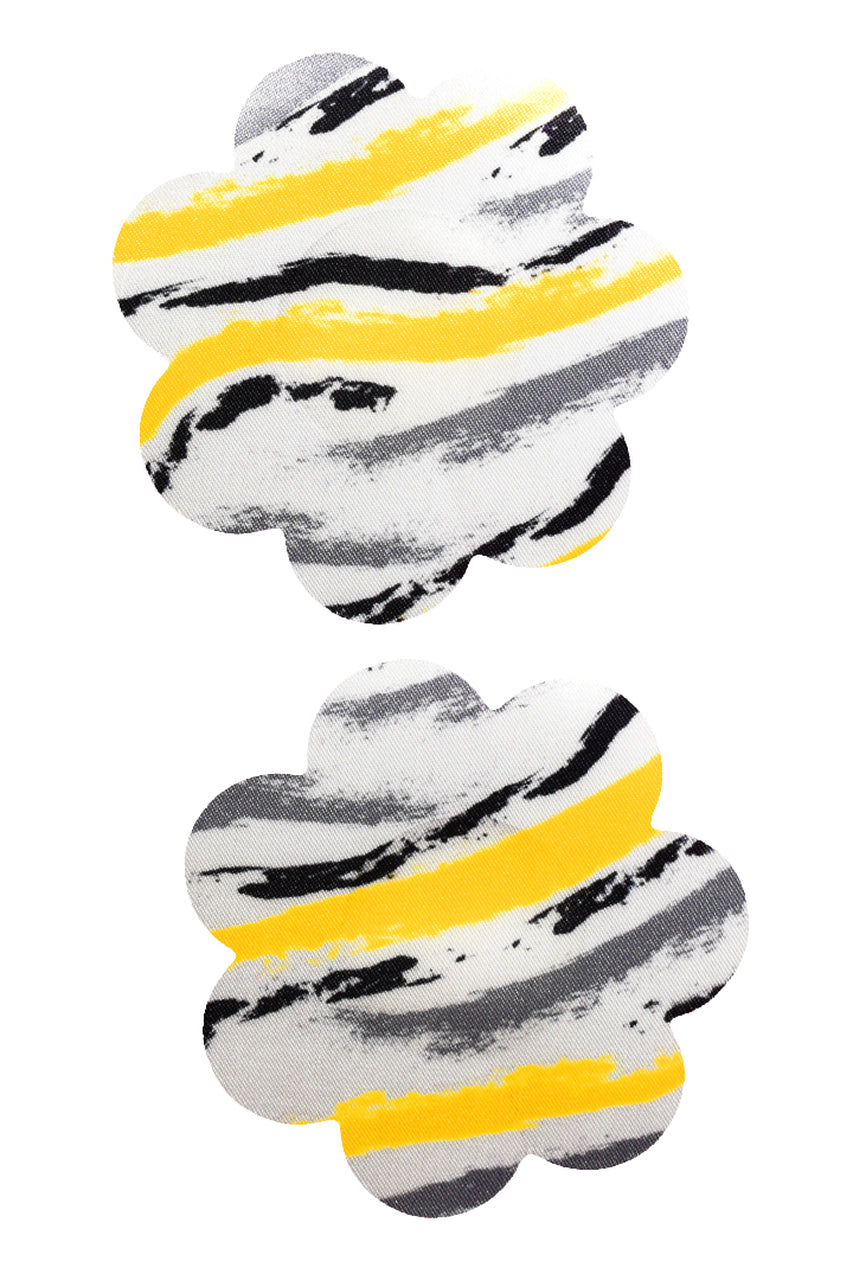 Grey. black. white. and yellow splash petal nipple pasties. Feature self adhesive tape. just peel and stick on clean. dry. oil-free skin.