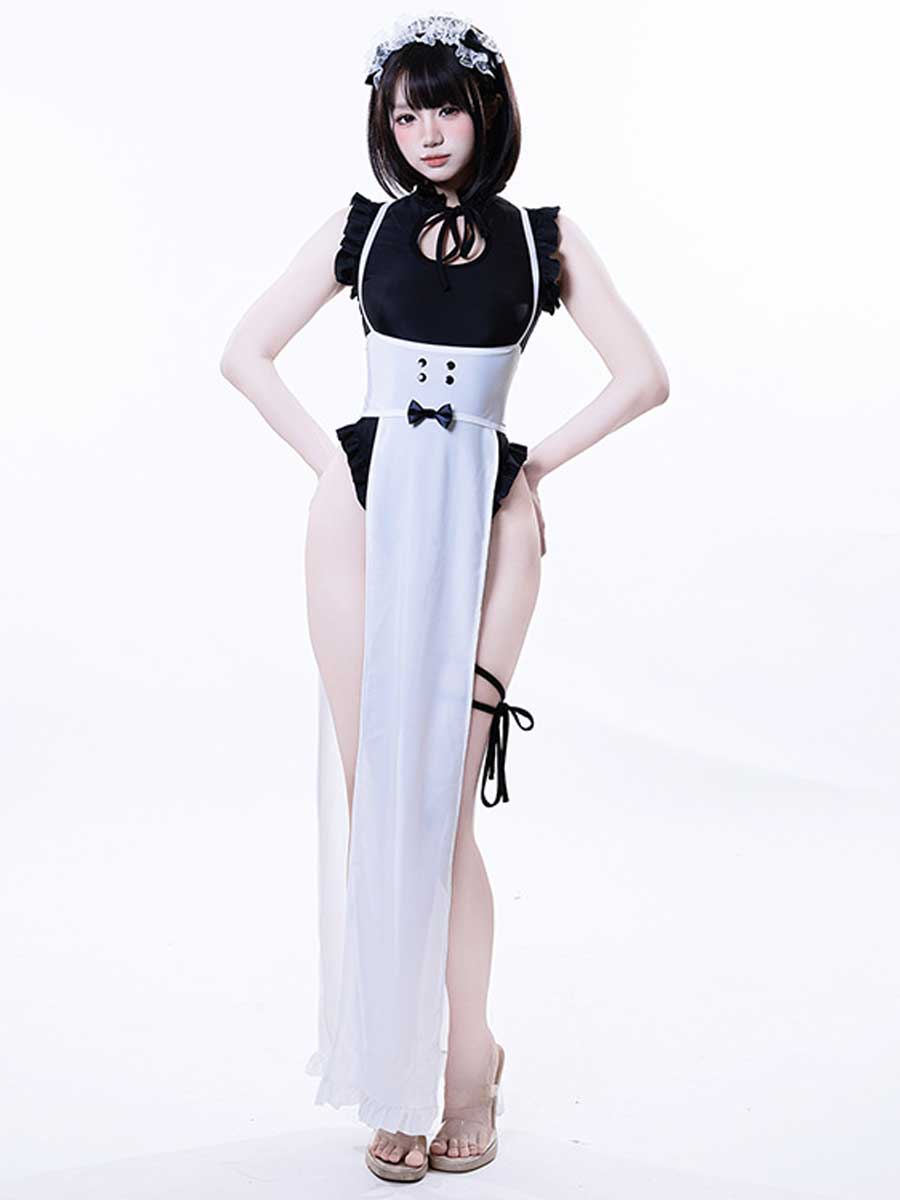 Design: Sexy Maid Cosplay Costumes featuring black bodysuit with ruffled trim. and a matching apron with adjustable suspenders. front and back draping panels.