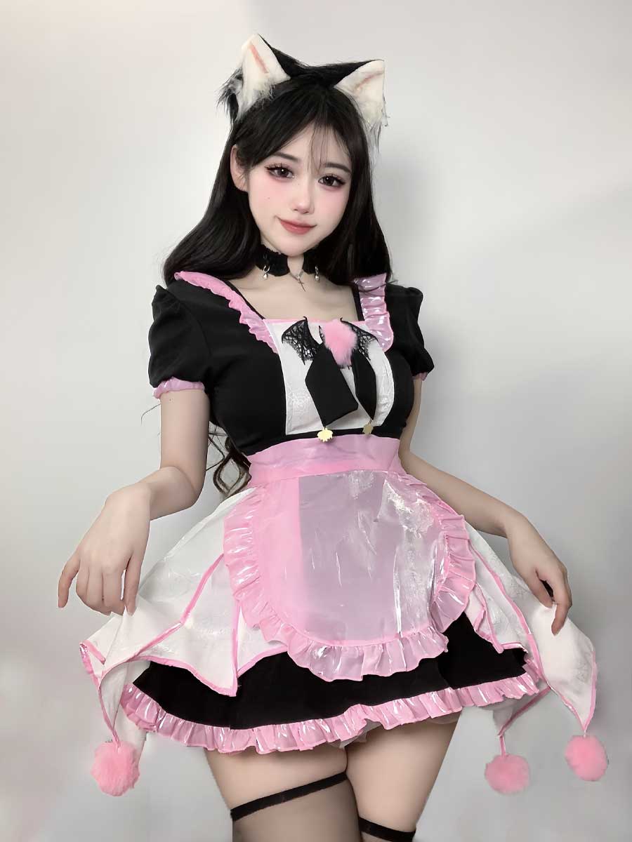 Design: Yomorio Sexy Maid Outfit featuring black and white mini maid dress with ruffled trim. puff short sleeves. front lace bat accents. sides draping panels with an attached furry poms. and a matching pink apron. back tie closure. A classic look with playful detailing. this outfit is designed for all your cosplay needs.