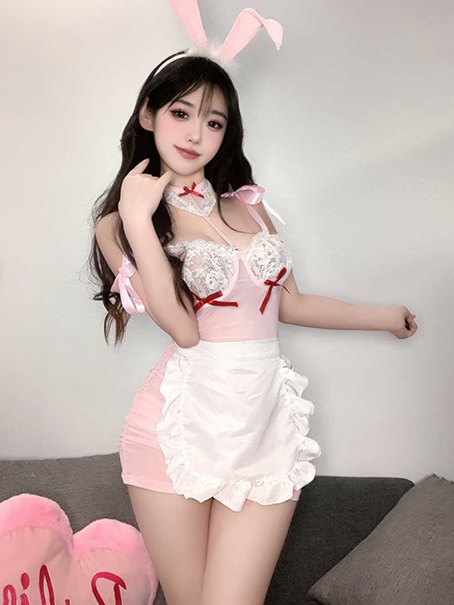 Design: This bunny girl costume featuring sheer white lace underwire cups. removable lace choker. self tie shoulder spaghetti straps. a red bow accent. an attached fuzzy white tail. and a matching maid apron. this costume creates an edgy yet playful look that will get all the attention.
