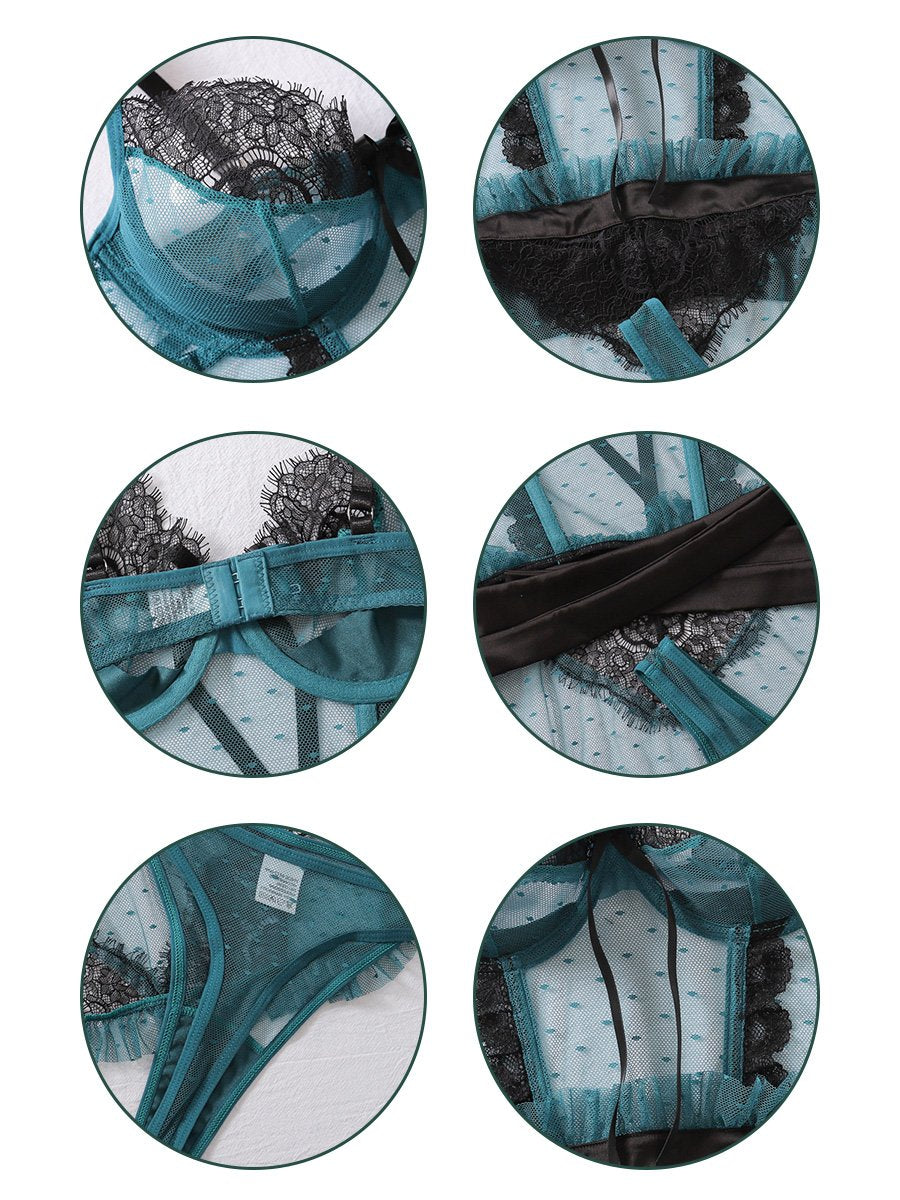 This super sexy lingerie set featurings sheer eyelash lace underwire cups with black lace trim. adjustable spaghetti straps. an allover polka dot design. a hook and eye back closure. an attached maid apron. and a matching mesh thong. You'll feel irresistible in this set. designed to make you look and feel your best.