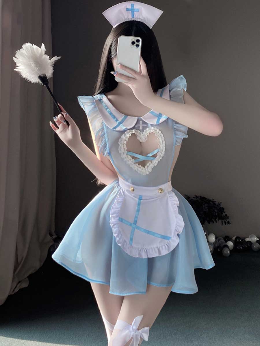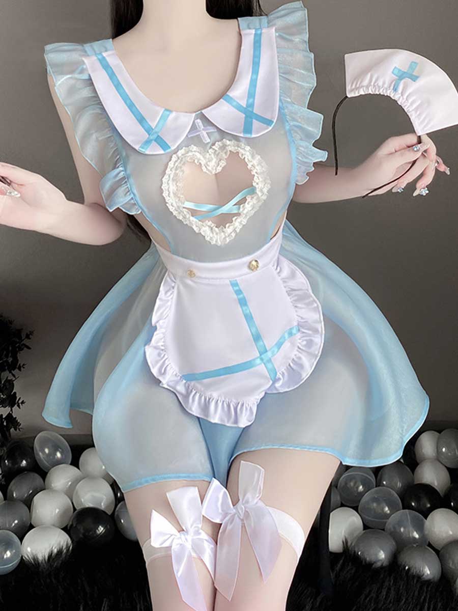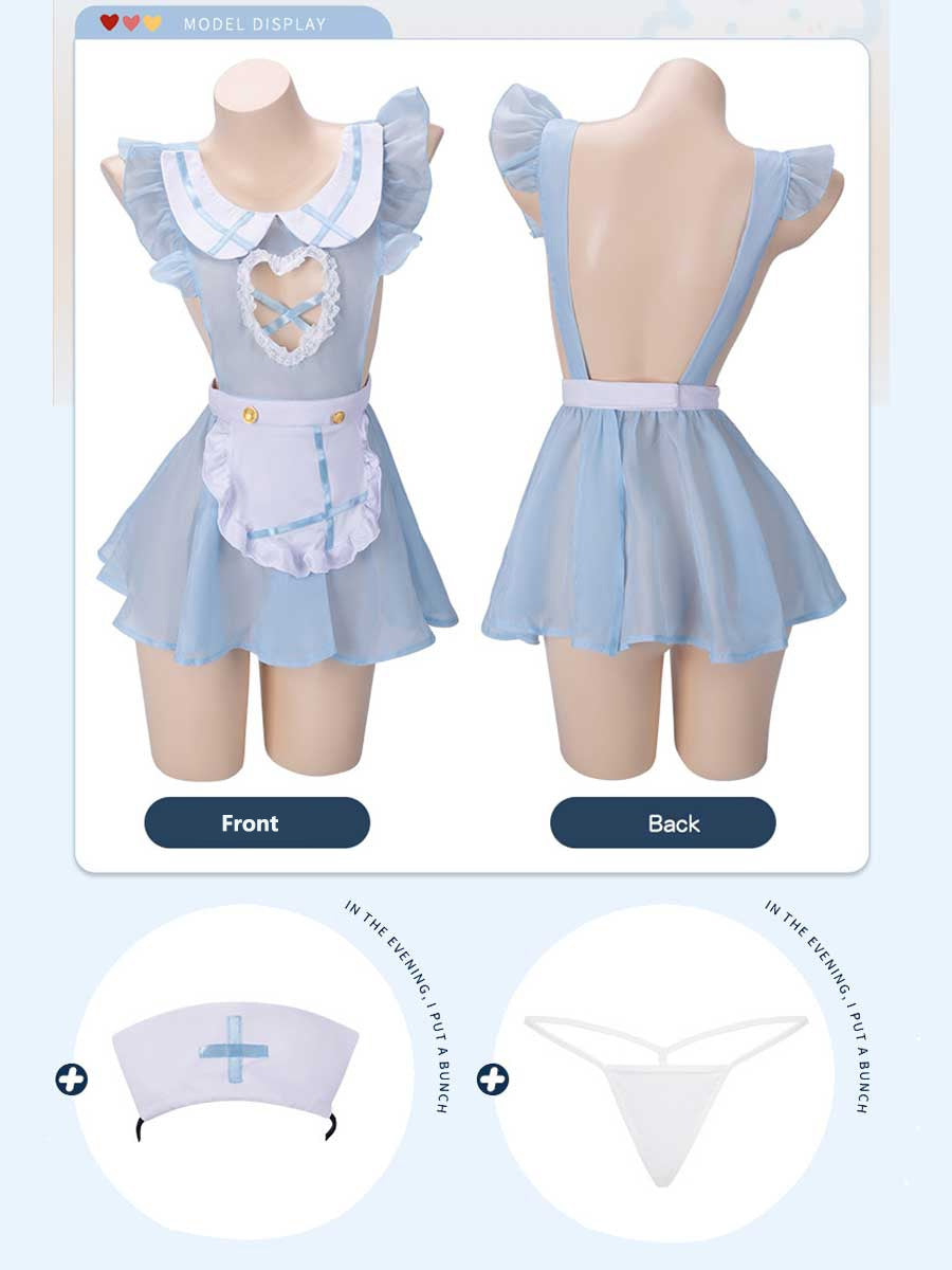 Design: Yomorio Sexy Maid Outfit featuring sheer mesh mini maid dress with ruffled trim. front heart shape cut out. open back design. and an attached maid apron. A classic look with playful detailing. this outfit is designed for all your cosplay needs.