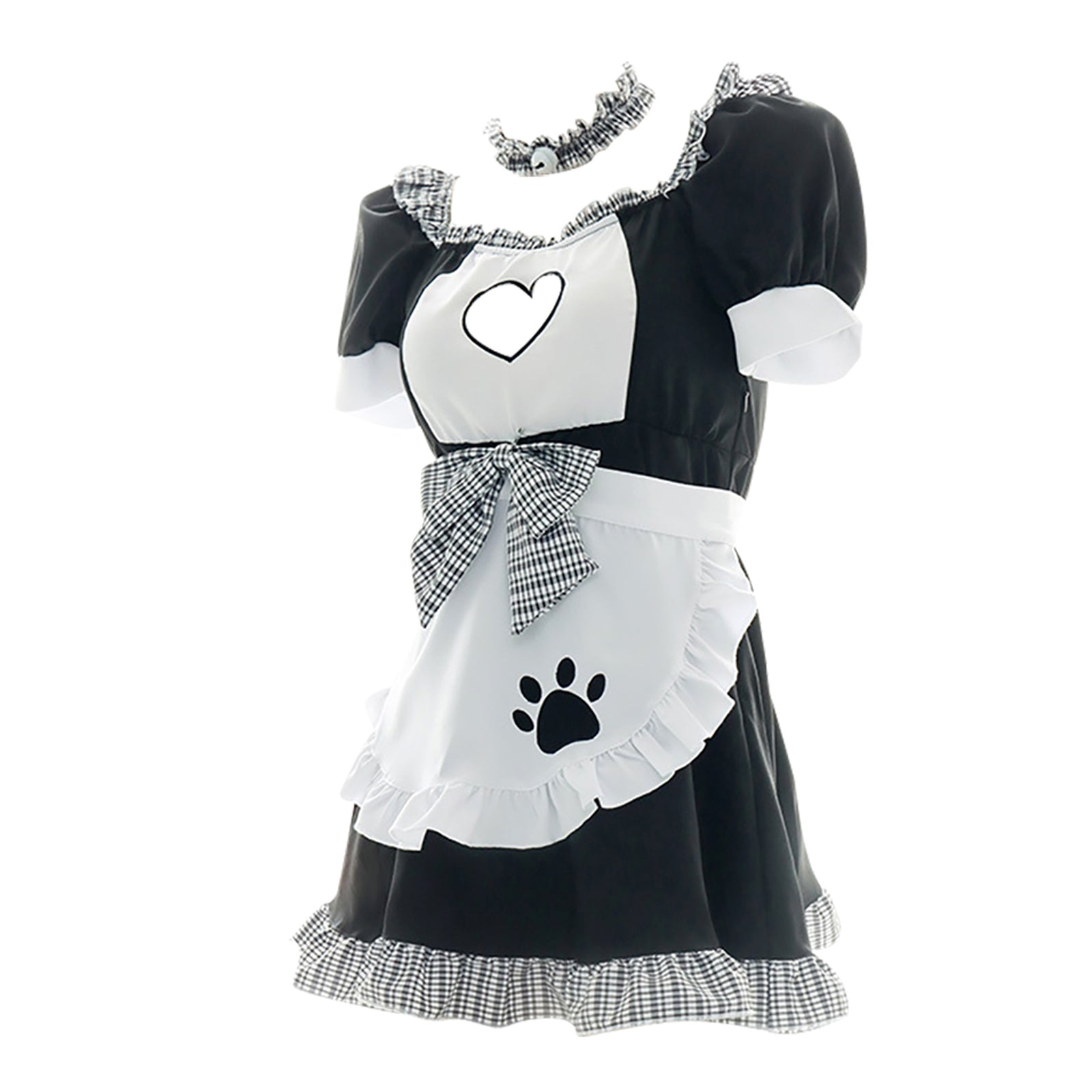Design: Yomorio Ruffle Trim Maid Lolita Costume Dress with Apron featuring a black and white dress with ruffled detailing. front heart cut-out. short puff sleeve. plaid bow accent. side zipper up closure. a white apron with embroidery cat paw. and a flirty hemline and a mini length.