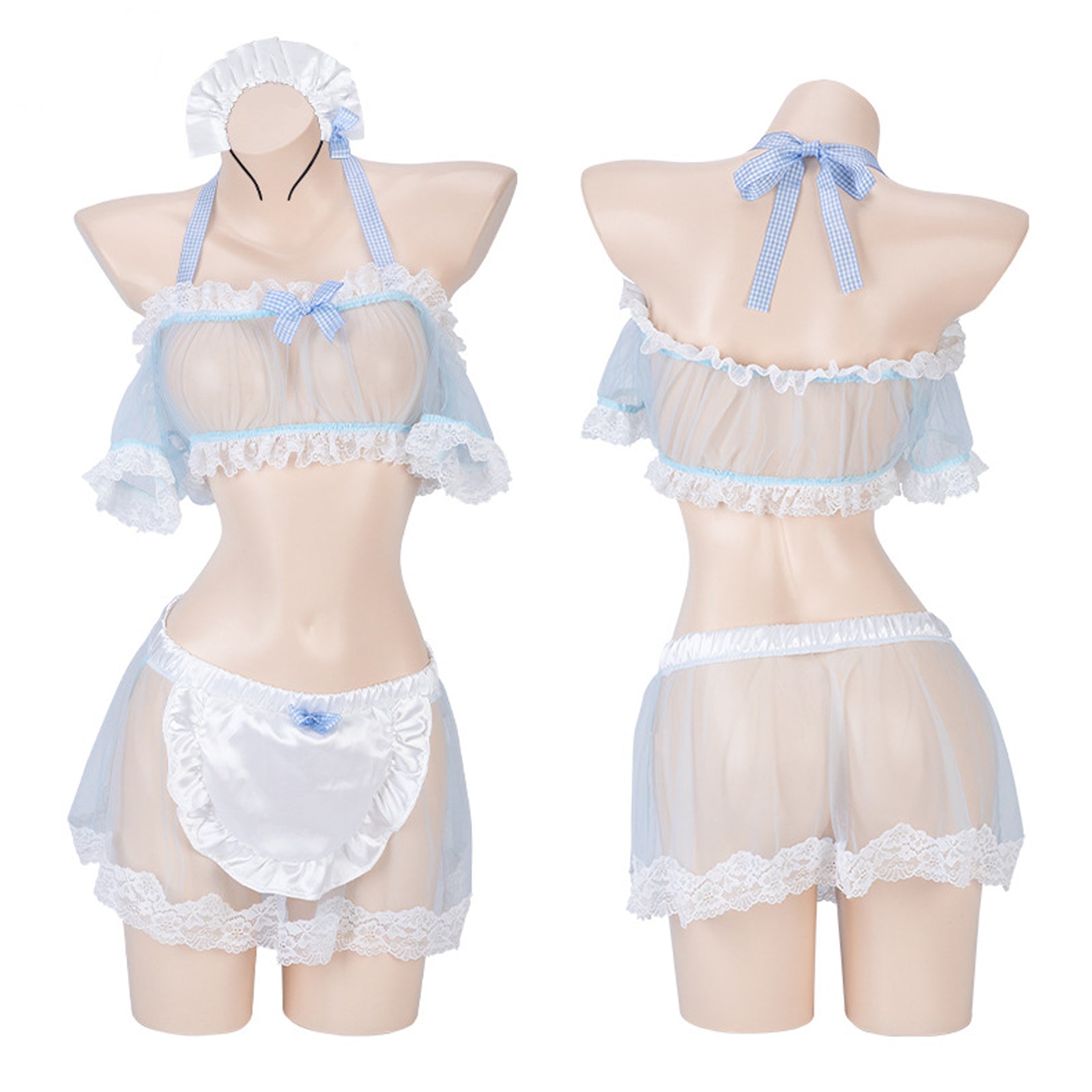 Design: Yomorio anime maid cosplay lingerie featuring a blue mesh bandeau style crop top with a ruffled lace trim. off the shoulder sleeves. satin bow accents. a matching mini skirt with attached apron. and lace ruffled hemline.