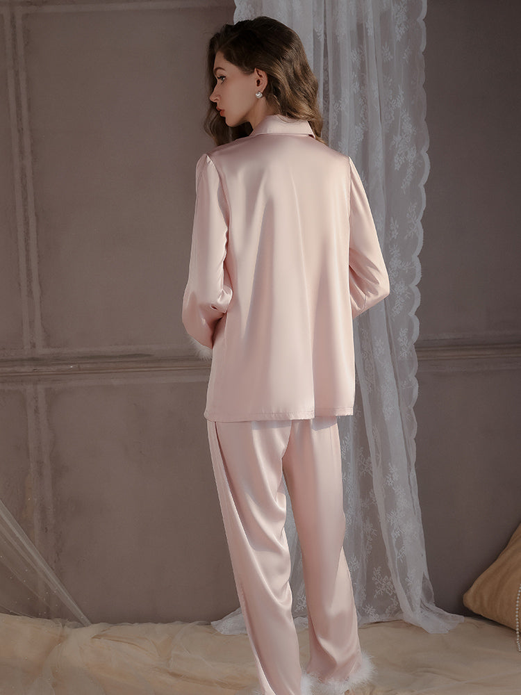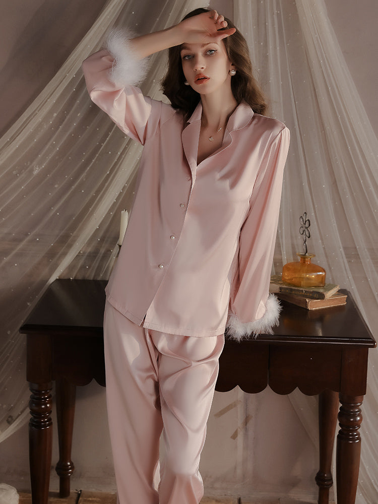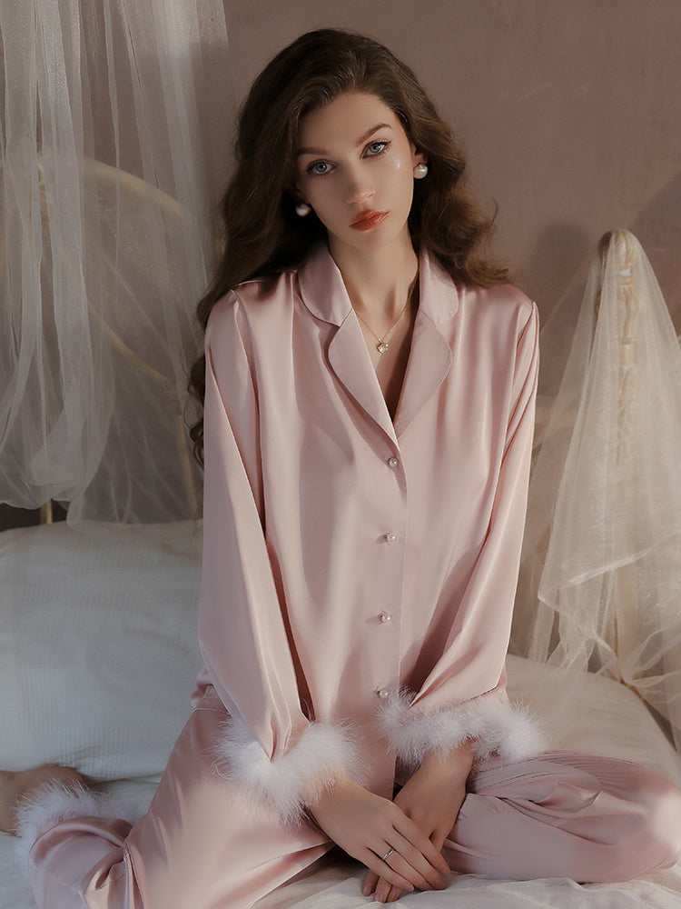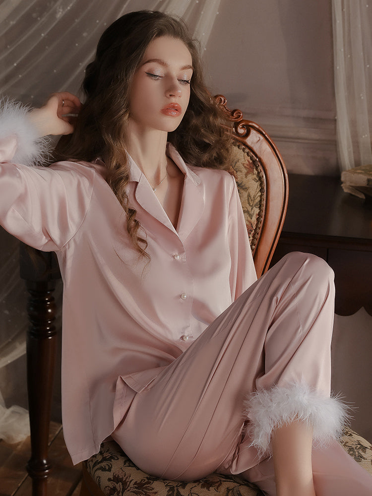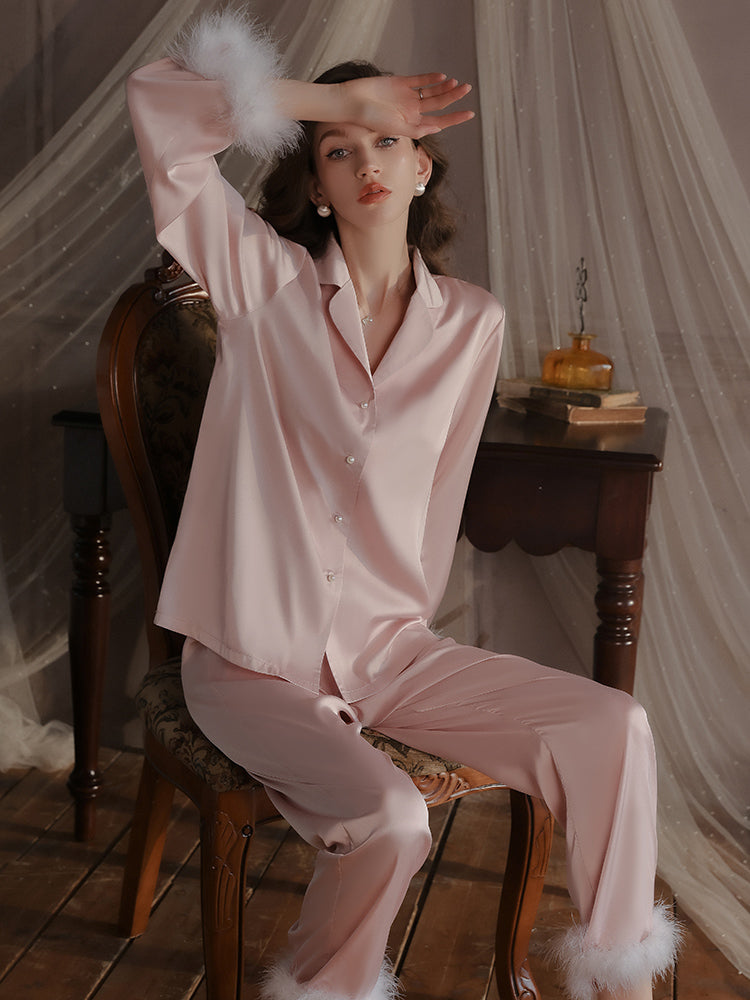 Experience ultimate comfort and style with this satin pajama set. Featuring delicate feather trimmed cuffs and a smooth satin finish. this set includes a button-front top with a soft lapel collar and relaxed fit matching pants. Perfect for lounging or bedtime. its timeless design blends sophistication and coziness.