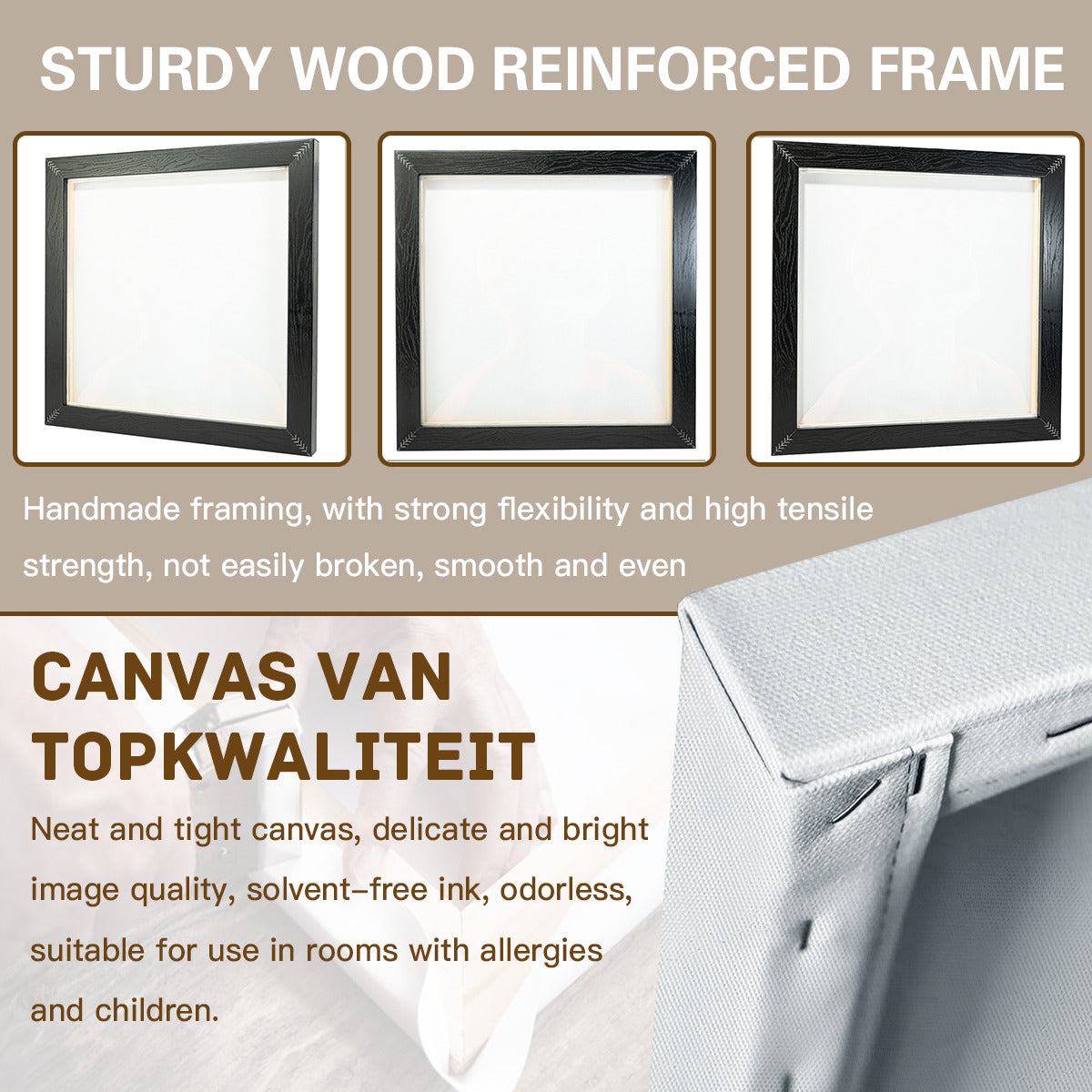 【 Material Description 】 Synthetic fiber canvas, pine wood inner frame strips, polystyrene suspended outer frame strips